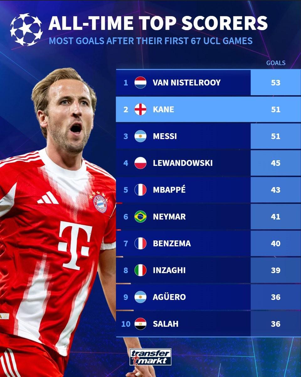 凯恩在与皇家马德里的欧冠1/4决赛首回合比赛中打入一球,至此,凯恩欧冠生涯67次出场已打入51球,据统计,只有范尼在欧冠前67次出场的进球数比凯恩更多。